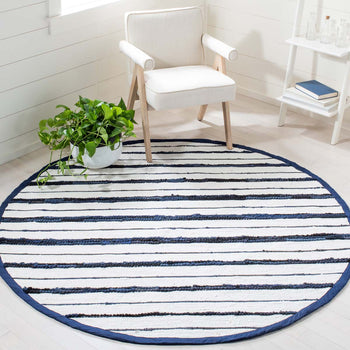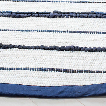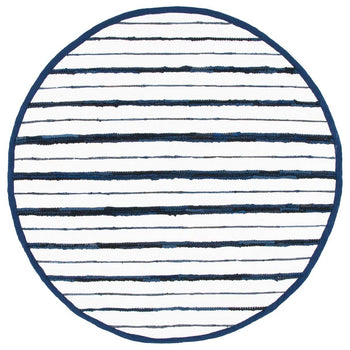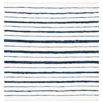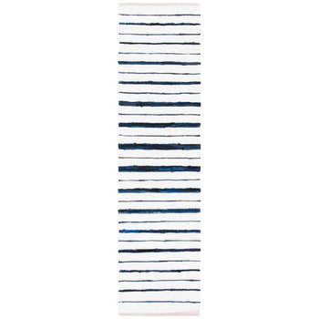 Crafted by skilled artisans in India, the rug showcases a dynamic pattern that draws inspiration from the abstract play of lines captured in the image provided. The bold navy stripes set against the crisp ivory background create an eye-catching design that's both modern and versatile, perfect for your living room, study, or any space that calls for a statement piece.
