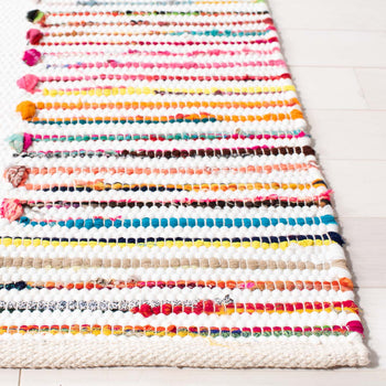 The expertly woven rug in Ivory and Red shades boasts a flat weave construction, a testament to the time-honored techniques practiced by skilled Indian artisans. Its fusion of polyester and cotton material ensures both durability and softness, a perfect blend that accommodates your everyday life with ease.