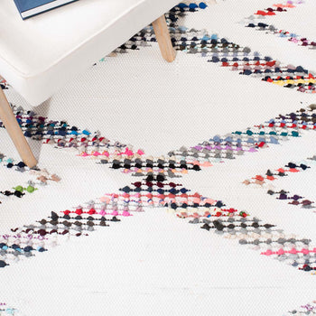 Featuring an intricate pattern reminiscent of traditional craftsmanship, this rug's symmetrical design offers a contemporary twist on classic styling. The array of vibrant colors woven amidst the ivory base reflects a spectrum of accent hues that easily complement various home decor themes. With a low profile height of 1/4", it seamlessly fits under furniture and in doorways, making it an incredibly versatile addition to your living area, bedroom, or study.