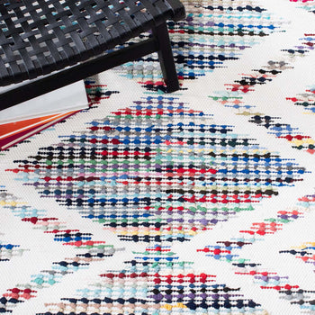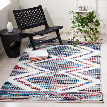 The palette of ivory and blue imbues the rug with a sense of tranquility and sophistication. The intricate pattern displayed in the image exudes an eclectic charm, featuring geometric motifs that create a dynamic visual statement. This design perfectly captures the essence of modern aesthetics while paying homage to cultural heritage.