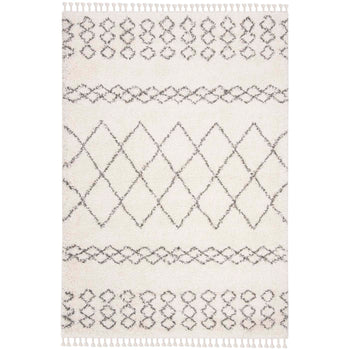 Featuring an elegant geometric diamond pattern, framed by a border of recurring motifs and a playful fringe, this rug infuses any space with a modern yet timeless charm. Its soft ivory base accented with grey designs will complement a variety of decors, making it a versatile choice for any living area, bedroom, or study.