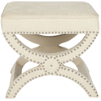 A contemporary descendant of the classic Savonarola chair, the Mystic Ottoman gracefully curves the distinctive X style frame. Upholstered in taupe linen with silver nail head detailing, use Mystic in pairs under a console, in front of the bed, or anywhere you want a touch of glamour.