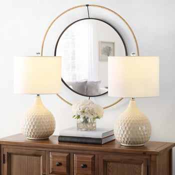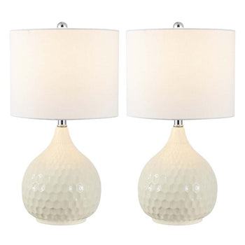 Give your decor an artistic modern touch with this Nalon Table Lamp. A textured hexagon honeycomb pattern swirls over Nalon's gourd silhouette of sculpted ivory ceramic, beautifully offset by the clean lines of a modern drum shade, making it a designer favorite. Sold in sets of two.