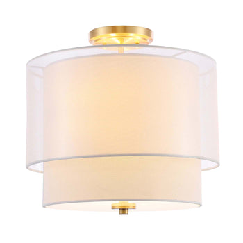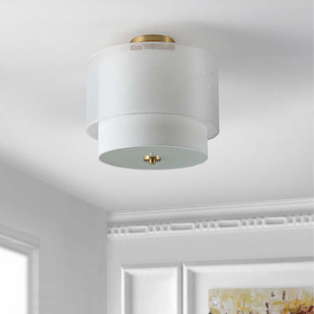 A modern take on a timeless design, this Namida Flush Mount is an absolute essential in elegant contemporary interiors. Namida's clean-lined off-white fabric shade is given additional depth with a concentric glass one, and its gold iron details make it shine in any room.