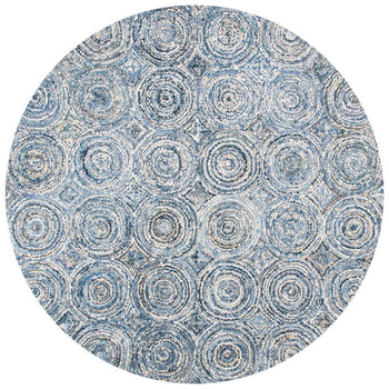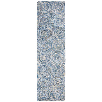 The runner rug showcases an elegant pattern of spiraling circles that create a rhythmic and harmonious visual effect, evoking the mystical beauty of mandalas. The swirls of different shades of blue, complemented by delicate touches of neutral tones, make this runner an eye-catching piece that can easily blend with various interior decor styles from modern minimalist to more traditional settings.