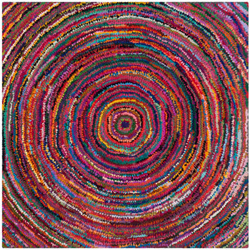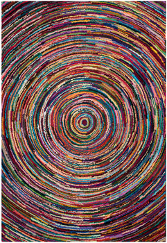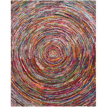 The design features a dazzling array of colors swirled in a hypnotic spiral pattern that draws the eye inward, creating a mesmerizing effect. This multi-colored rug captures the essence of a painter's palette, with rich hues that pop against any flooring.