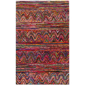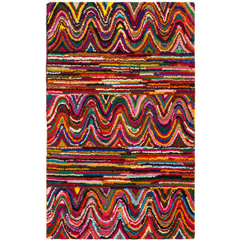 Introducing our vibrant 2' X 3' hand-tufted cotton accent rug, a stunning piece of textile art that is sure to inject life and color into any space. Crafted with care in India, this accent rug showcases a mesmerizing array of colors in a dynamic and playful pattern that features a unique blend of wavy lines and stripes, evoking a sense of movement and energy.