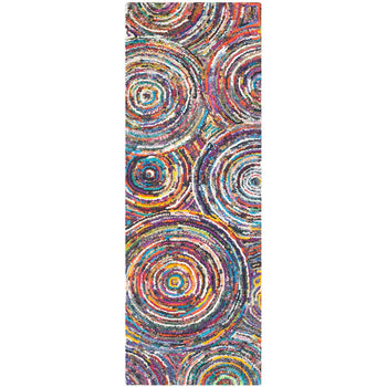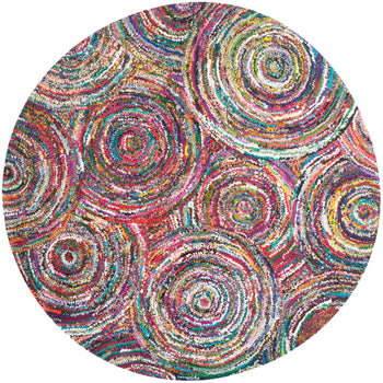 Introducing our vibrant and artful accent rug, a veritable tapestry for your floors. This 2' X 3' area rug is a kaleidoscope of color, featuring a spirited arrangement of concentric circles that radiate outwards, each strand dancing with a symphony of hues that captivate and charm. Hand tufted in India with meticulous care, this piece boasts a plush 3/4" pile height, inviting you to sink your feet into its comfortable embrace.