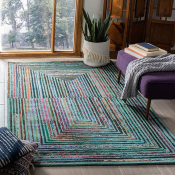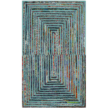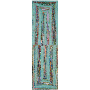 Adorned in a tantalizing teal hue, this runner invites an air of sophistication and contemporary style into any hallway or narrow space. The dynamic rectangular patterns dance across the rug in a mesmerizing fashion, drawing inspiration from modern artistry and reinforcing a sense of movement and depth. The multicolored stripes within the rectangles add a playful spectrum of vivid colors that enhance the teal base, ensuring that this piece stands out as a statement of bold elegance.