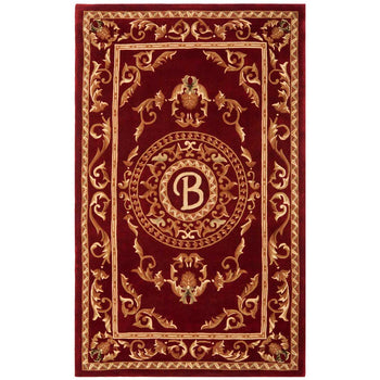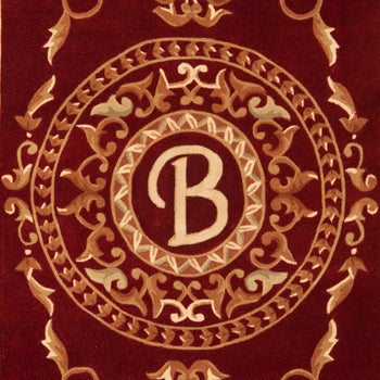 The intricate pattern features ornate detailing reminiscent of classic design, with a central monogram-like motif that adds a personal touch of grandeur. The symmetrical floral accents and border patterns in complementary tones create a harmonious look, making it a versatile addition to either traditional or contemporary decor.
