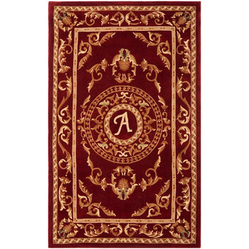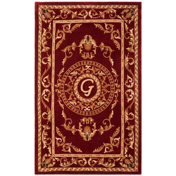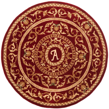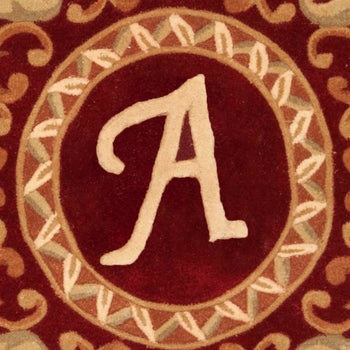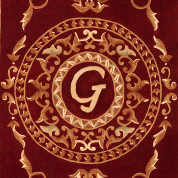 Crafted in China, this round rug draws inspiration from classic styles, featuring intricate patterns with floral and scroll motifs that encircle a central emblem, evocative of monogrammed heirlooms. The rich burgundy hue is accented by the contrast of soft beige and subtle greens, enhancing the overall sophistication of the design.