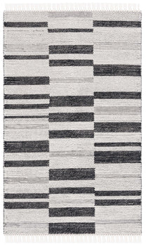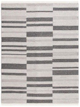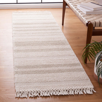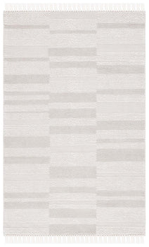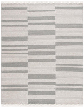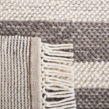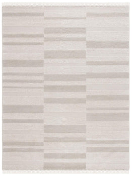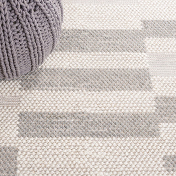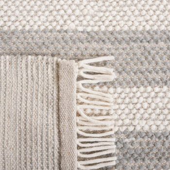 This rug boasts a chic and modern pattern, as displayed in the image, featuring a sophisticated series of stripes that combine different weaving styles for a textured, layered look. The striking ivory and silver color palette ensures it blends seamlessly with a range of interiors, from classic to modern minimalistic.