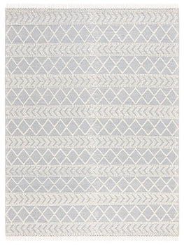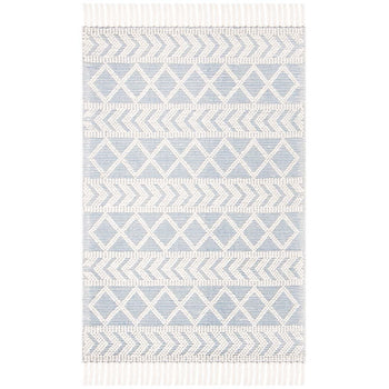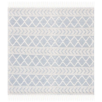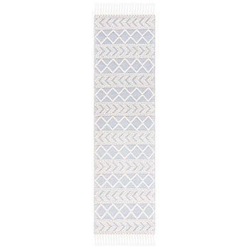 Embracing a serene blue and ivory palette, this rug showcases a striking geometric pattern that draws the eye and adds an air of sophistication to any room. The intricate design, visible in the image provided, features a harmonious sequence of diamond motifs bordered by delicate linear accents, embodying the characteristic vibrance of Bohemian decor.