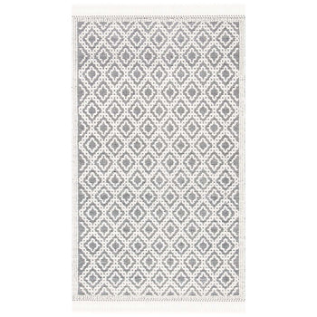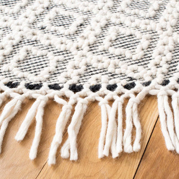 The rug showcases a mesmerizing ivory and black color palette, with a bold geometric diamond pattern that draws inspiration from age-old Bohemian motifs. The design radiates a sense of worldly charm and free-spirited artistry, making it an eye-catching statement piece for your home.