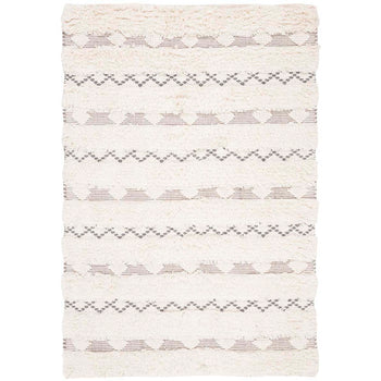 The sophisticated blend of 70% Polyester, 15% Wool, and 15% Cotton offers durability, a gentle touch, and a slight sheen, capturing the essence of modern indulgence with a hint of traditional craftsmanship. The ivory and grey color palette provides a tranquil backdrop, while the harmonious pattern, visible in the image, features a series of organic motifs and geometric shapes, infusing your space with a sense of balance and cultured style.