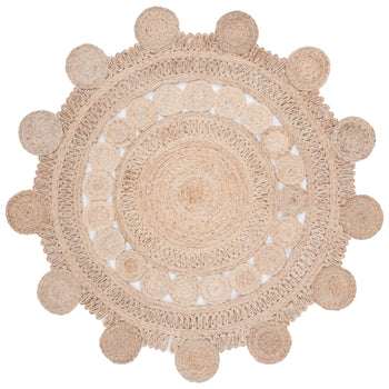 Drawing inspiration from traditional techniques, the rug features an enchanting circular pattern with a series of concentric circles and looped accents that bring a sense of depth and texture to your floors. The natural hues of the jute fiber offer a warm, earthy palette that complements a wide range of color schemes, making it a versatile addition to your home.