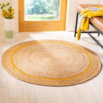Introduce a touch of sophistication and style to your space with this stunning 3ft x 3ft round area rug. Masterfully handwoven from top-quality Jute materials in India, this rug prides in a premium construction that guarantees durability and long-lasting use. Its beige and gold color scheme is a versatile and appealing blend that adds a warm, radiant glow to any room. This rug showcases a contemporary style that blends well with a variety of decor themes. With a comfortable height of 1/4 inch, the rug provides a soothing underfoot feel that complements its refined look. Celebrate the fusion of fashion and comfort with this exotic Indian handmade Jute rug.