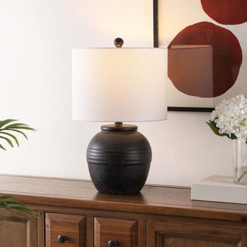 Illuminate and beautify your home with the grace and sophistication of our Naturi table lamp. Enriched with classic details and contemporary sensibilities, our table lamp stands out with its timeless aesthetics. Its voluminous black base attains character with a beautiful ribbed detail. Our table lamp is finished off with a contrasting white drum shade to add warmth and character to your nightstand, console, or side table.