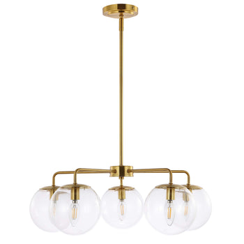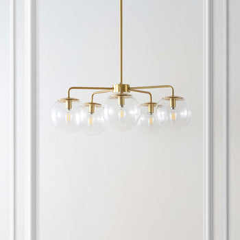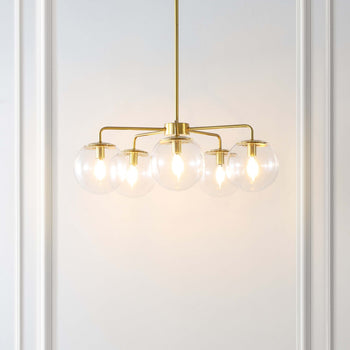 Transform your Decor with the unique elegance of this Negara Chandelier. The visible bulbs inside Negara's clear glass shades lend a fun retro feel to its industrial-chic brass frame, casting a stylish glow above the dining room table or in the fashion-forward boudoir.