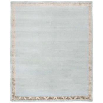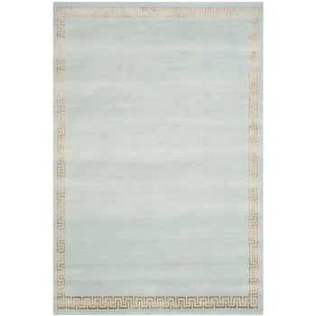 The rug features a captivating aqua base color, beautifully complemented by a sophisticated gold geometric pattern border that frames the rug, creating a visual delight. This classic combination brings a serene yet luxurious appeal to your home decor.