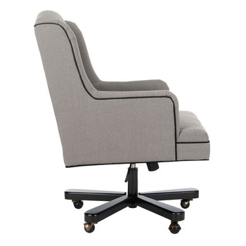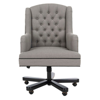 Inspired by English cigar lounge seating, this high back diamond tufted Nichols Office Chair is lavishly upholstered in granite linen with contrasting black cording. Designed for ergonomic comfort, Nichols glides on a black metal base with versatile casters.
