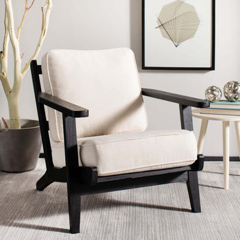 This Nico Mid Century Accent Chair updates any living room with elegant ease. Crafted of finely carved oak, Nico's generously filled bone white linen cushions is perfectly framed by a deep black finish. Designers often use it in pairs to create an instant conversation area.