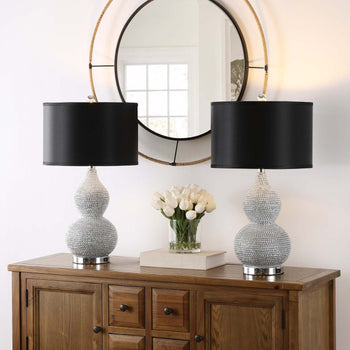 Let your decor bask in the shimmering glamour of this Nicole Table Lamp. Nicole's double gourd silhouette is unapologetically lavish in its designer details, completely encrusted with tiny silver beads, while a black satin shade adds a clean, modern edge. A built-in USB port makes Nicole a must-have on a bedside table or in the living room. Sold in sets of two.