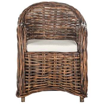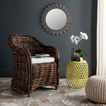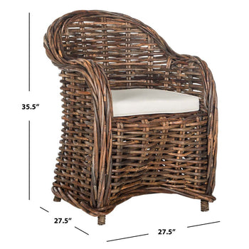 Grace your home with the look of a tropical resort with this naturally variegated woven rattan club chair in tones of brown. Replete with rolled arm that curves up to the top of the chair back, this comfy open weave chair is a natural beauty.