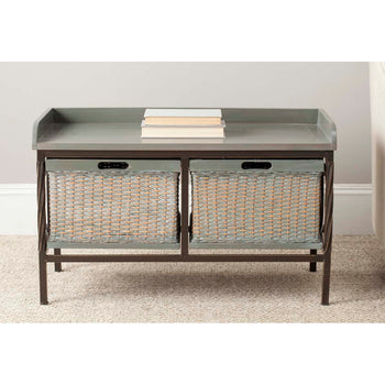 The Noah Storage Bench is a welcome addition to any entry hall, mud room, or family room. Noah's French grey seat is perfect for removing rain boots or shoes after a long day, and two wicker style baskets tucked in an intricately detailed antique pewter frame offer discrete yet stylish storage.