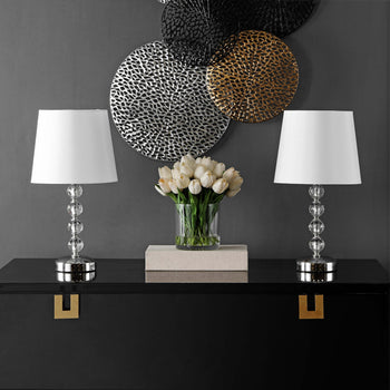 Artful faceting adds glamorous brilliance to any room the elegant Nola Stacked Crystal Ball Table Lamp inhabits. Crafted in the traditional style of European glassmakers, crystal looks fresh and new in its arrangement and design. An updated off-white barrel shade completes the look. Available in a set of two, the table lamp comes with a built-in USB port to keep your devices charged and ready.