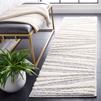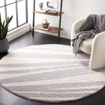 Adorned with a gracefully flowing striped pattern, the design weaves together varying shades of grey with the softness of ivory, offering visual interest without overwhelming your space.