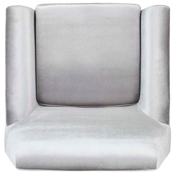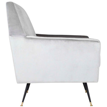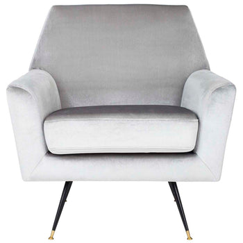 Make a bold statement in any room with this retro Mid Century sofa chair. Its geometric angles allow for a generous seat with maximum style. A designer favorite, its light grey velvet and gold cap legs bring instant character to any modern space.