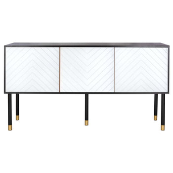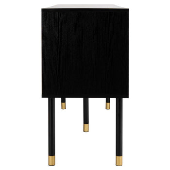 Designed with retro flair, this TV stand brings contemporary flair to vintage style. Perched on swanky black metal legs with brass caps, it hides clutter with ease, and its gorgeous black and white wood top makes it ideal for displaying a flat screen.