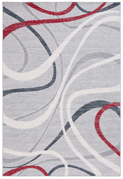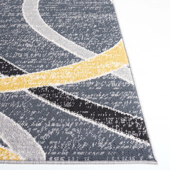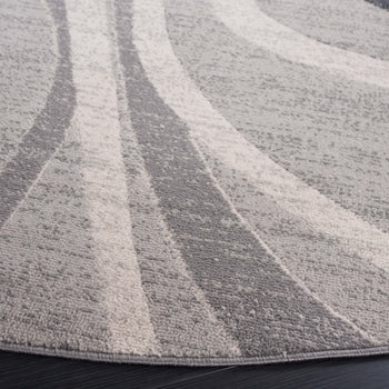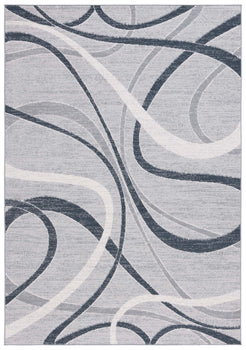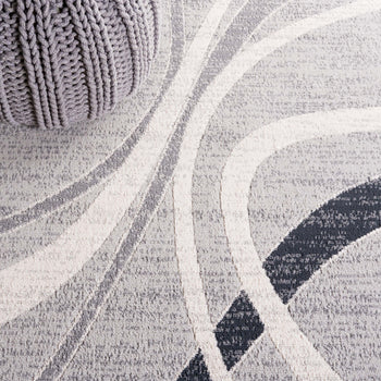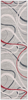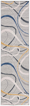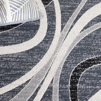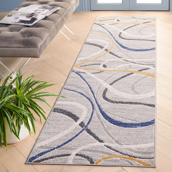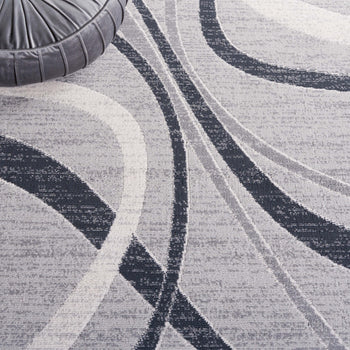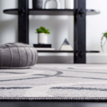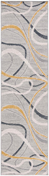 The rug features a modern aesthetic with a timeless grey and ivory palette, seamlessly integrating with various decor styles. Its fluid pattern depicted in the image showcases an artistic interplay of lines and curves that bring an organic and lively feel to any corridor or narrow space it adorns.