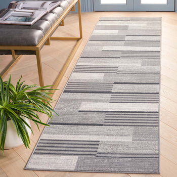 The runner's color palette is a refined blend of grey and black, gracefully intersected with ivory, creating a distinct pattern that will captivate the eye and enhance your existing decor. This power-loomed piece from Turkey embodies modern elegance, boasting a design that will remain timeless.