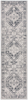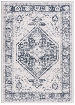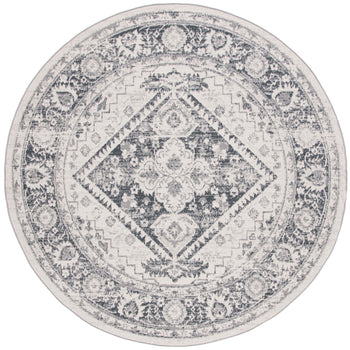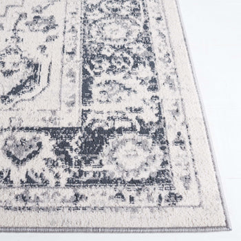 The rug's pattern tells tales of antique charm and old-world aesthetics, featuring intricate medallion motifs and border patterns in a serene ivory and grey color palette. Its soft hues seamlessly blend with a variety of decor themes, making it a versatile choice for your home.