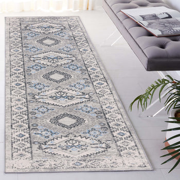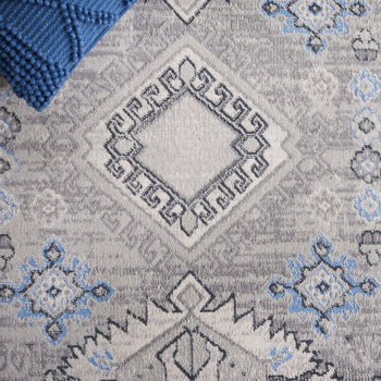 Elevate your home decor with this stunningly crafted traditional runner area rug, meticulously power-loomed for precision and durability. Measuring a versatile 2'-2" X 8', this rug's sophisticated grey and light blue color palette infuses a serene yet elegant atmosphere into any long, narrow space such as hallways or kitchen floors.