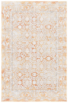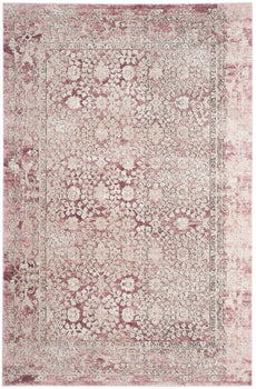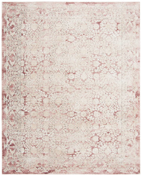 The rug's romantic rose hue is gently muted with touches of beige, presenting an understated yet sophisticated palette that complements a variety of decor styles. Adorned with a classic pattern that exhibits intricate floral motifs and ornate borders, the design imbues a serene, antique charm into any room.
