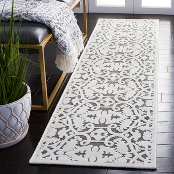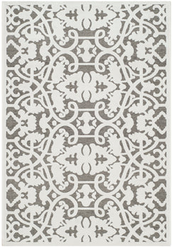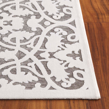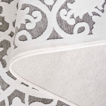 Crafted in Turkey with meticulous attention to detail, the rug boasts a sophisticated Ivory / Dark Grey color palette that effortlessly complements various interior designs. The power-loomed construction ensures durability and a consistent pattern, while the carefully selected blend of materials? 45% Viscose, 35% Polyester, 15% Cotton, and 5% Latex, provides a luxurious feel and easy maintenance.