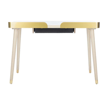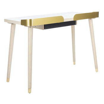 Bring the drama and character of vintage style to any home office with this modern 1 drawer desk. Meticulously crafted with an oak wood blend featuring a timeless white washed finish, its retro capped legs and gold details make it a new design classic.