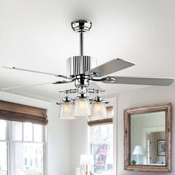 Sleek and sophisticated, this contemporary ceiling light fan ensures a comfortable lifestyle all year round. Complete with 3 glass lights, its metal construction features a chrome finish perfect for any decor. Designers love its value and versatility.
