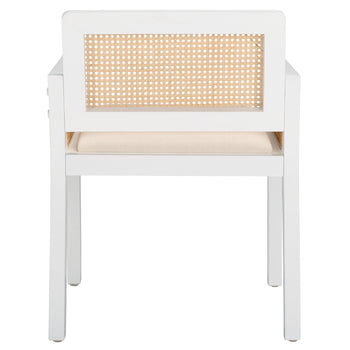 Introducing the Patrina Armed Dining Chair, a beautiful blend of nature and elegance right at your dining space. Crafted with quality wood and woven rattan, this chair complements any home decor style seamlessly. The eye-catching design is not just about visual appeal – it ensures robustness and durability, too. The luxurious white cushion promotes comfort and timeless charm, captivating the attention of your guests in no time. Transform your dining experiences with the chic and comfortable Patrina Armed Dining Chair, where sophistication meets comfort.