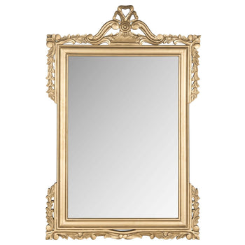 Brimming with scrolls and curves, the highly decorative Pediment mirror by Safavieh brings a touch of elegance to traditional rooms. Beautifully curved to create architectural interest, this rectangular mirror is finished in a lustrous shade of gold.[Use this graceful wall adornment to brighten any space with depth and dimension.]