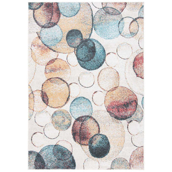 The rug's alluring pattern features an array of overlapping circles in a sophisticated palette of ivory and rust, with hints of cool blues and rich reds that add depth and character to any room. Each circle is beautifully defined, showcasing an artful mix of colors that will enrich your home with a contemporary yet timeless aesthetic.