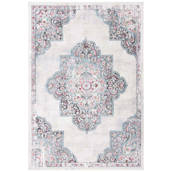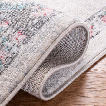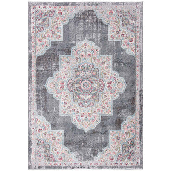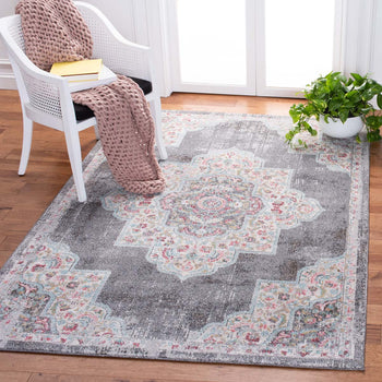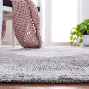 The rug exudes sophistication, featuring an intricate pattern that weaves a story of classic charm and modern finesse. The central medallion motifs are framed by delicate borders, all presented in a chic grey and ivory palette, punctuated with tasteful pops of a coral-like hue that will breathe life into any corridor or narrow space.