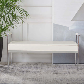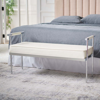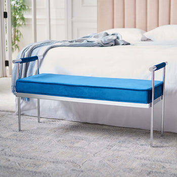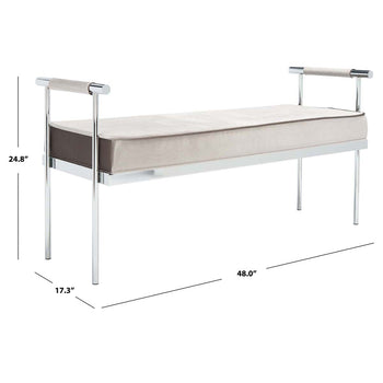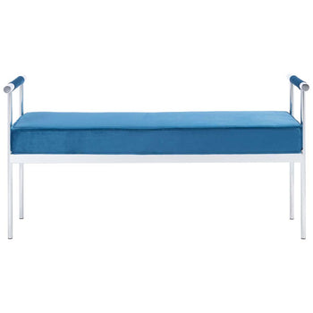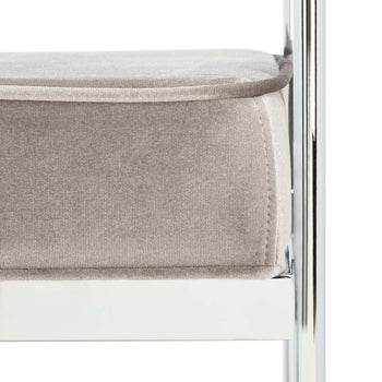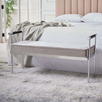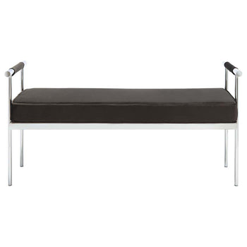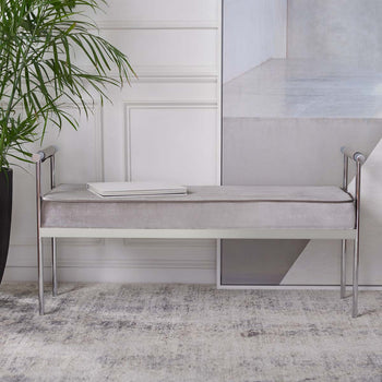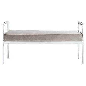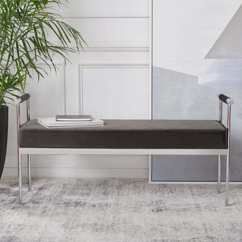 This Pim Long Rectangle Bench refreshes Bauhaus classics for today's contemporary Decor, making it the perfect finishing touch to any modern interior. Pim's plush shale velvet is luxuriously comfortable, and its sleek chrome finish is absolutely glamorous. Upholstered accents on the arms tie the look together.