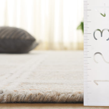 Discover the charm of our area rug, fashioned in the classic shades of beige and ivory. Hand-tufted with exceptional precision in India, this rug resonates with an age-old tradition of rug-making that truly sets it apart. The construction using a premium blend of wool and cotton ensures not only superior softness but also exceptional durability. Boasting a plush height of 3/8 inches, every detail exhibits the meticulous care taken in crafting this fine rug. The soothing hues make this piece a versatile one that harmonizes gently with your existing decor scheme. Bring home this exquisite Indian craft and elevate your space with its timeless appeal.