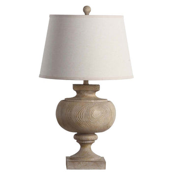 A sophisticated update to traditional lighting, this timeless 31 inch wood table lamp refreshes any living room. Designed with a neutral natural wood finish and round oatmeal shade that accentuate its curves, designers use it in pairs to frame a sofa.