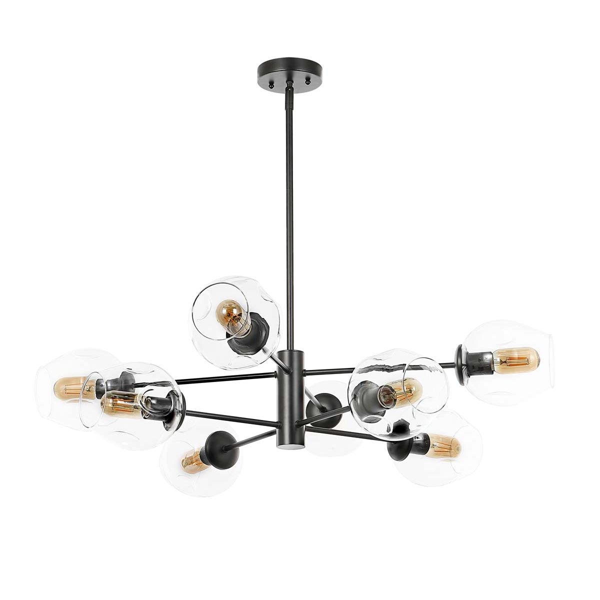 Brighten up your home with the eye-catching drama and elegance of our Pythea chandelier. Its sweeping arms propagate in different directions to deliver a dynamic and captivating ceiling light. Completed with clear glass shades and a sleek black finish, our chandelier makes a chic statement in an entryway, dining room, or open-plan lounge. Our gorgeous, 8-light chandelier creates a stunning display of each bulb to illuminate your home with a dose of warmth and style.