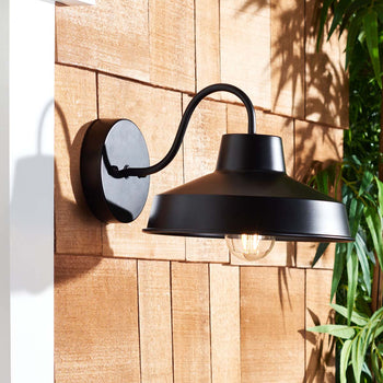 Brighten up your exterior walls with the retro charm of Quarry outdoor wall sconces. With a wide and streamlined dome, our wall sconce beautifully recreates a retro-industrial design. Stylish and classy, the wall sconce is anchored with a graceful winding arm and round backplate. It is adorned in a sleek black metallic finish to serve as the perfect complement to any outdoor space. The walls sconce can be arranged neatly in a row to illuminate your driveway, backyard, and patio.